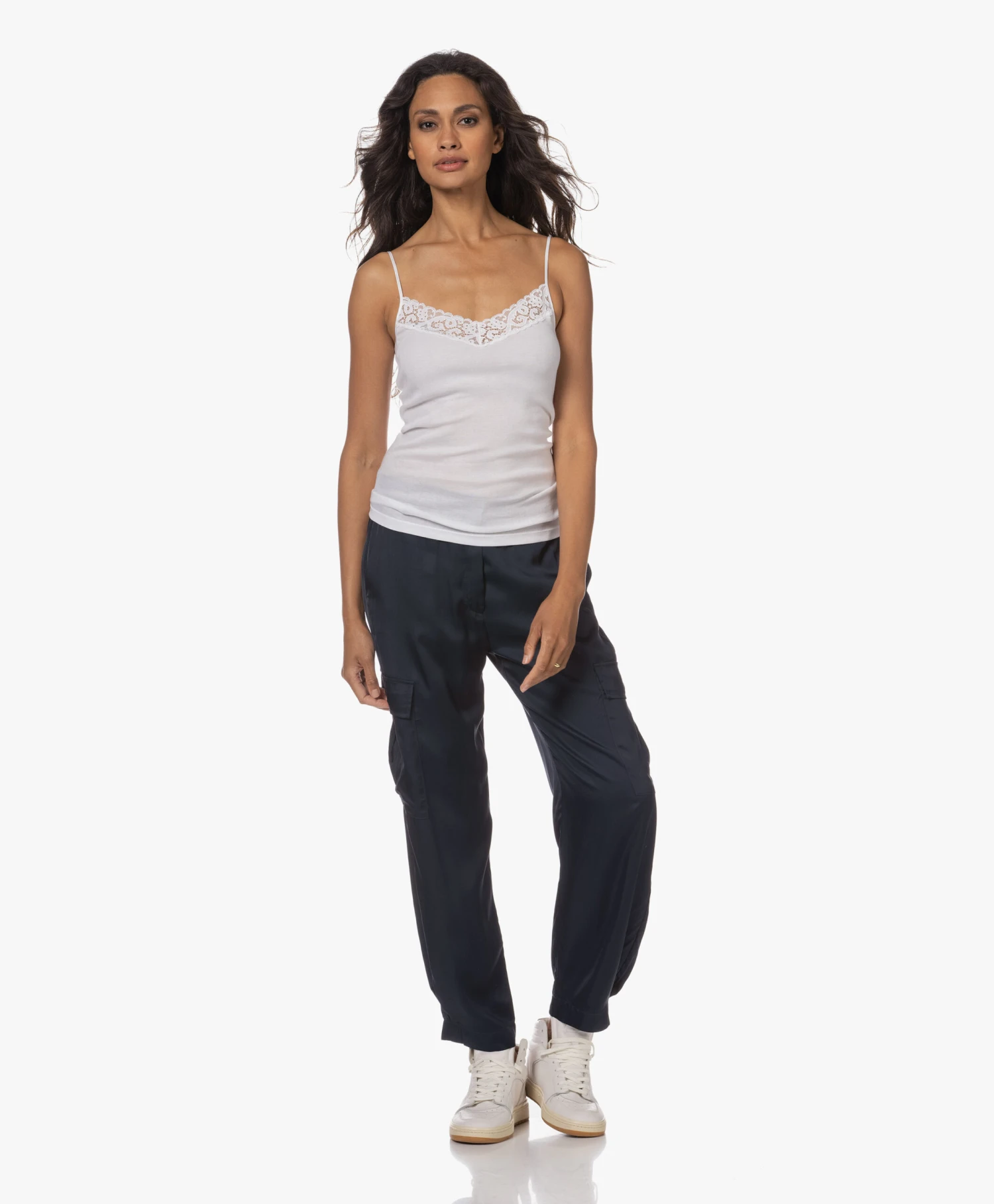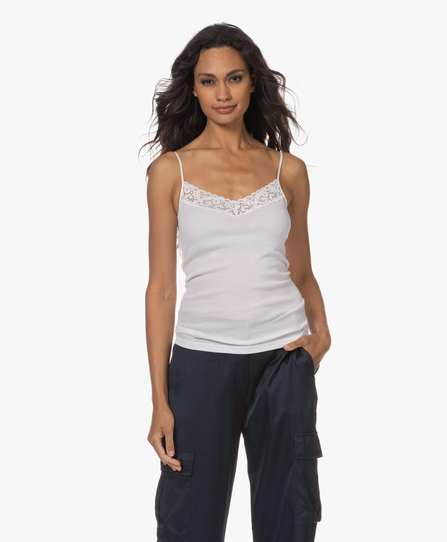 Deze naadloze spaghetti top van HANRO is gemaakt van zacht en lichtgewicht gemerceriseerd katoen in een fijne ribkwaliteit. Deze witte top toont een delicate kanten afwerking voor een sexy touch. Creëer de perfecte basis met de bijpassende ‘soft cup’ BH en de slip of hipster of draag gelaagd onder een vest of blazer voor een zachte vrouwelijke touch. Â