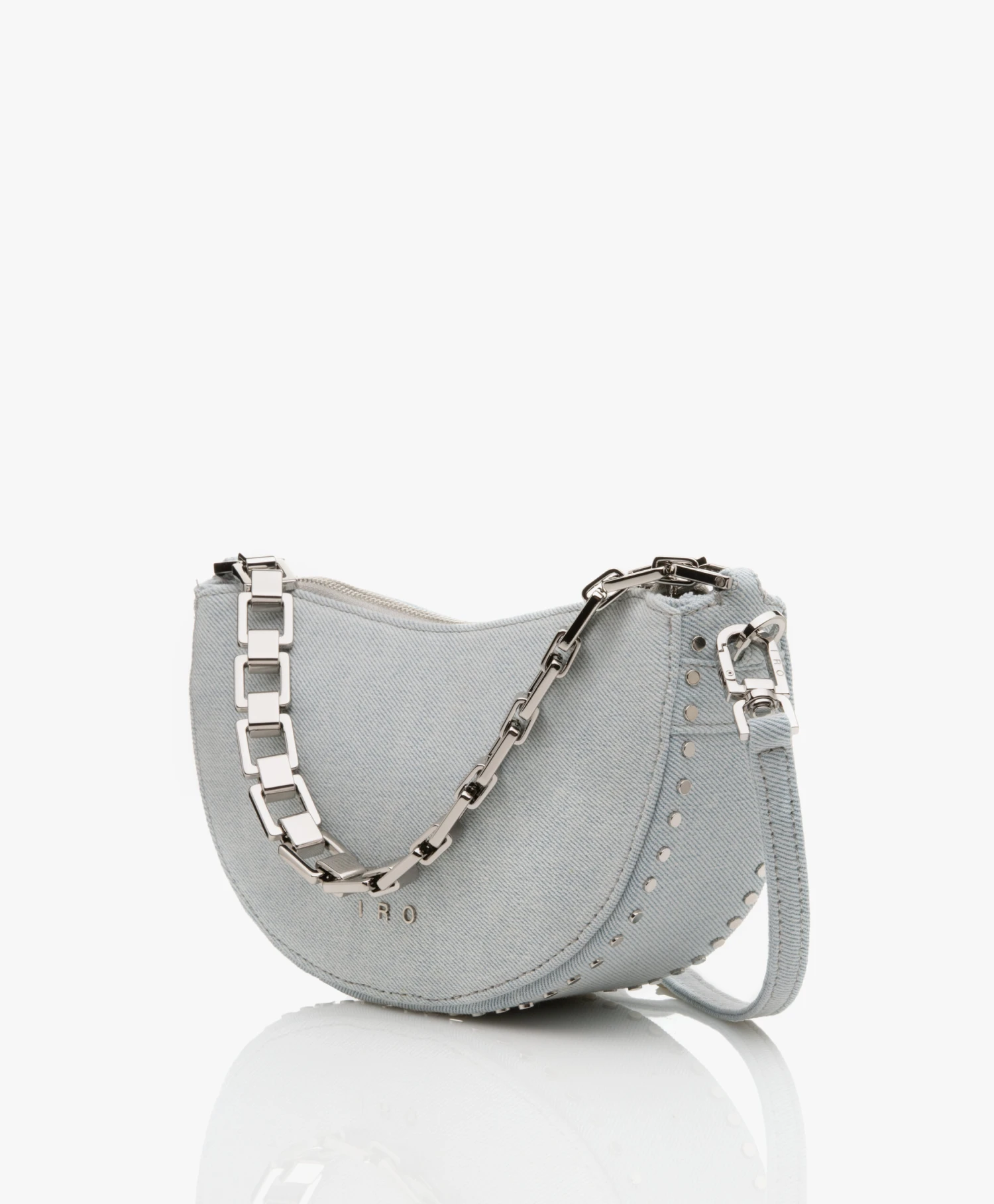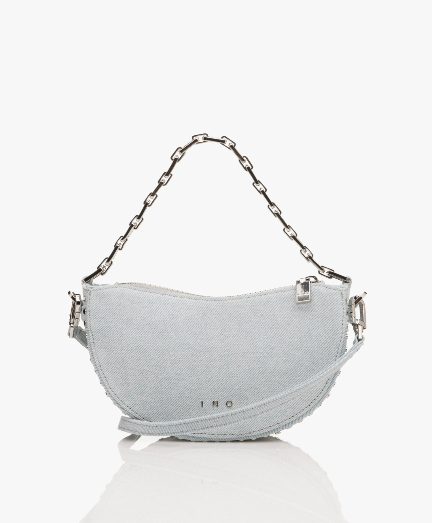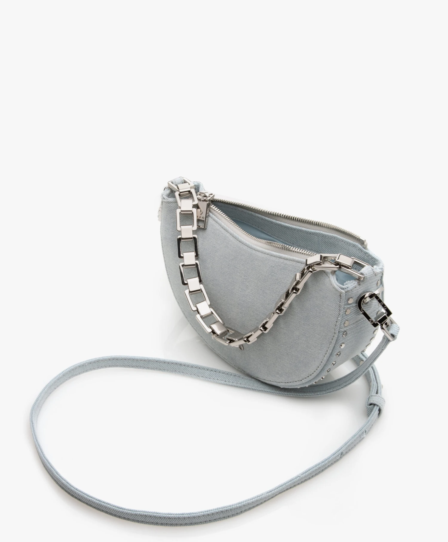 Statement-tas, iemand? IRO’s Arc tas is ditmaal uitgevoerd in een kleinere versie in lichtblauwe denim met zilverkleurige ketting, perfect om jouw outfit een 90’s knipoog te geven. De compacte tas is ontworpen in de vorm van een halve maan en draag je dankzij de korte draagriem van stevig metaal nonchalant over je schouder. Ritssluiting aan de bovenzijde, lichtblauwe katoenen voering.