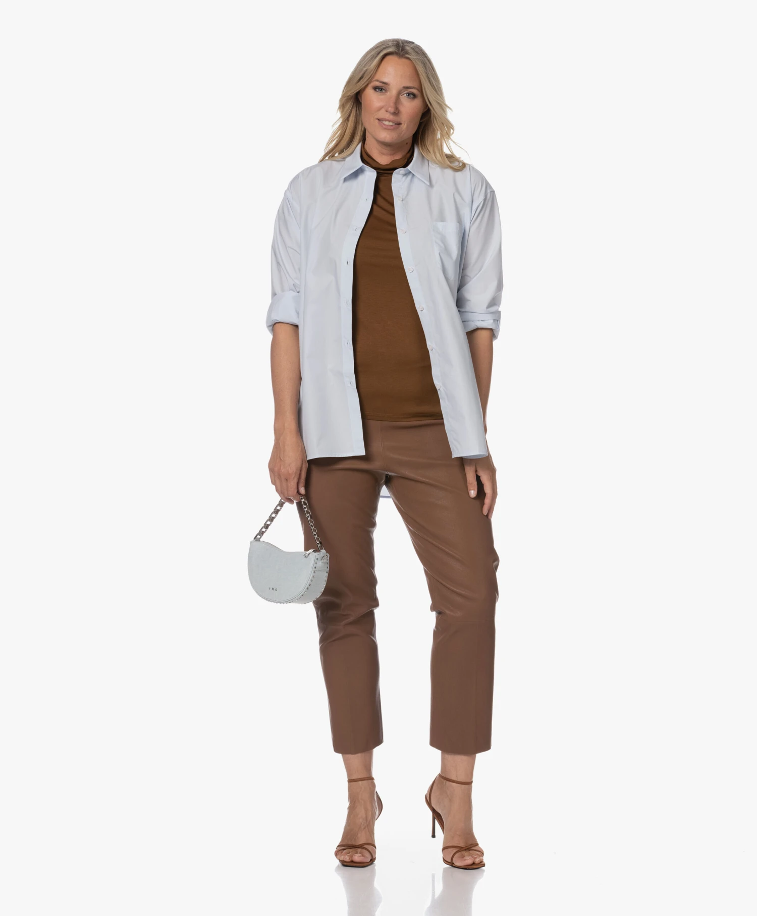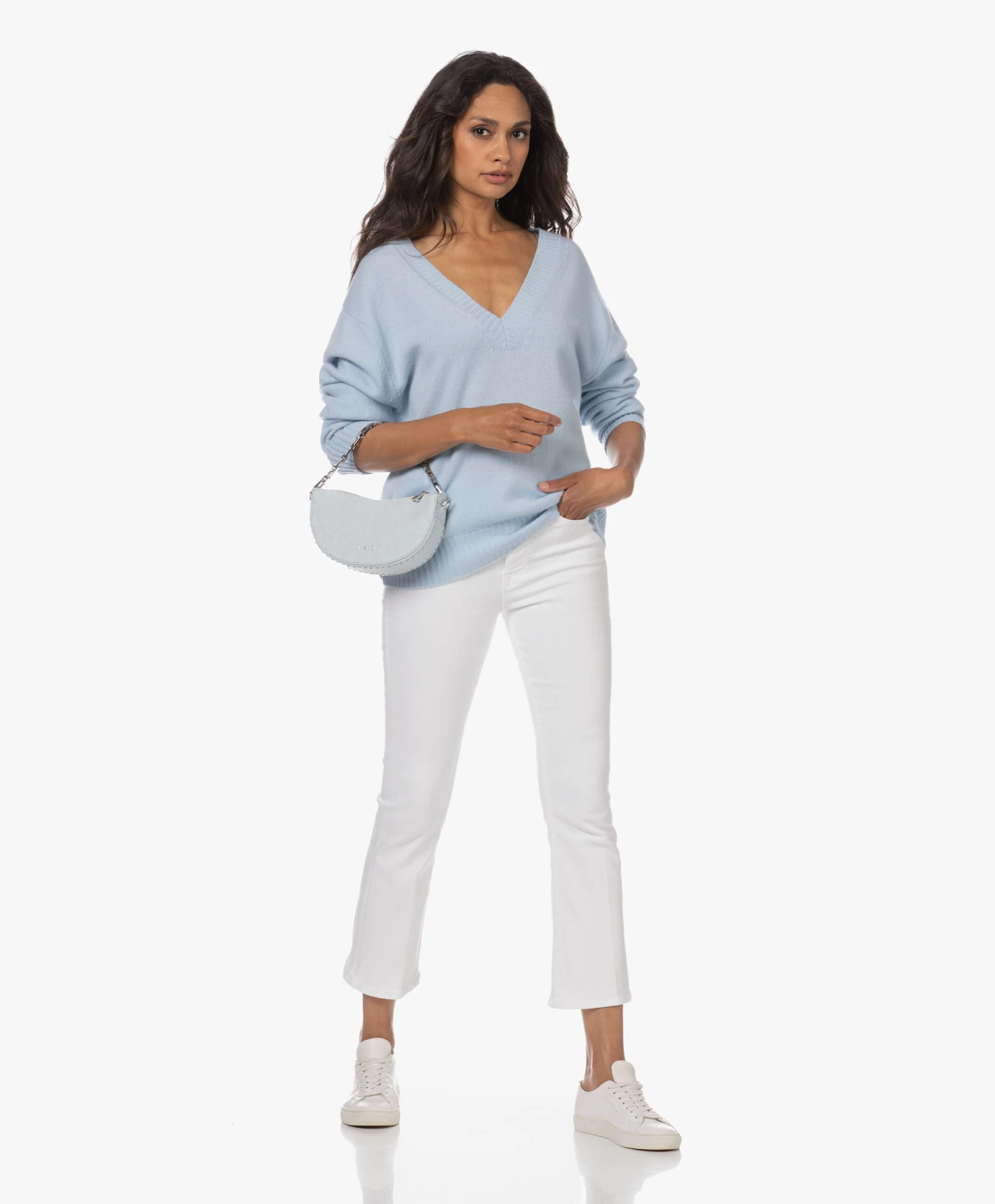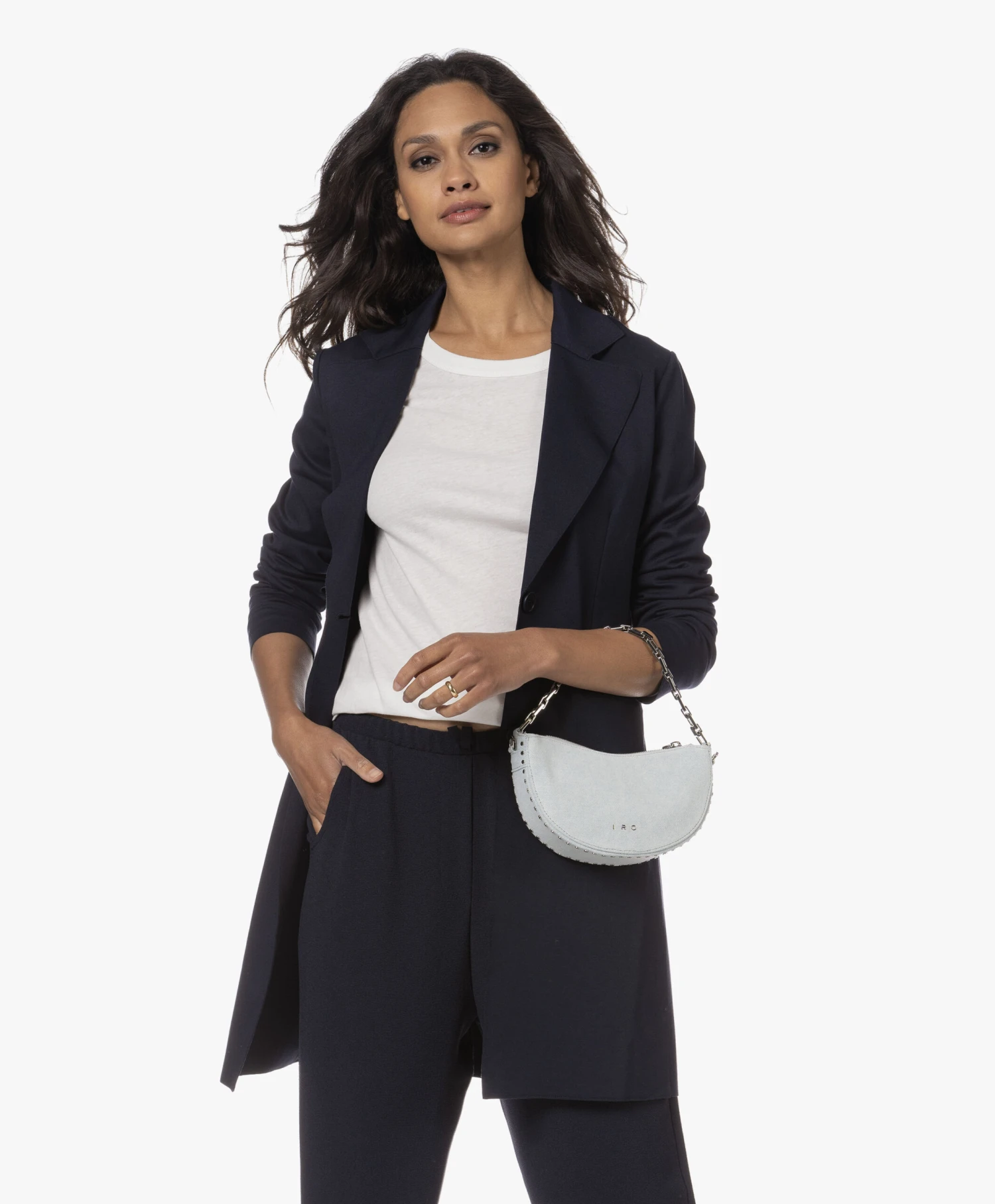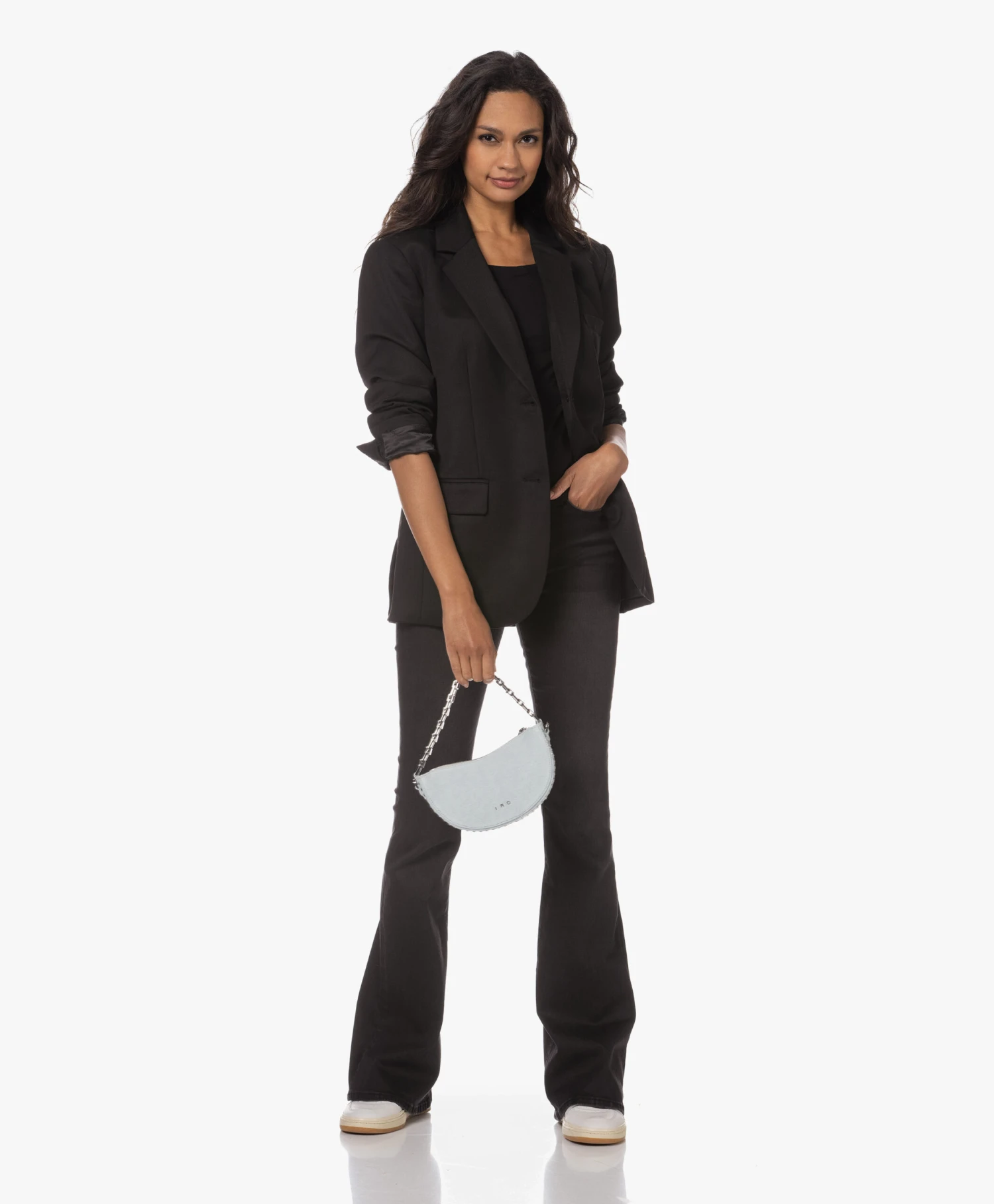 Statement-tas, iemand? IRO’s Arc tas is ditmaal uitgevoerd in een kleinere versie in lichtblauwe denim met zilverkleurige ketting, perfect om jouw outfit een 90’s knipoog te geven. De compacte tas is ontworpen in de vorm van een halve maan en draag je dankzij de korte draagriem van stevig metaal nonchalant over je schouder. Ritssluiting aan de bovenzijde, lichtblauwe katoenen voering.