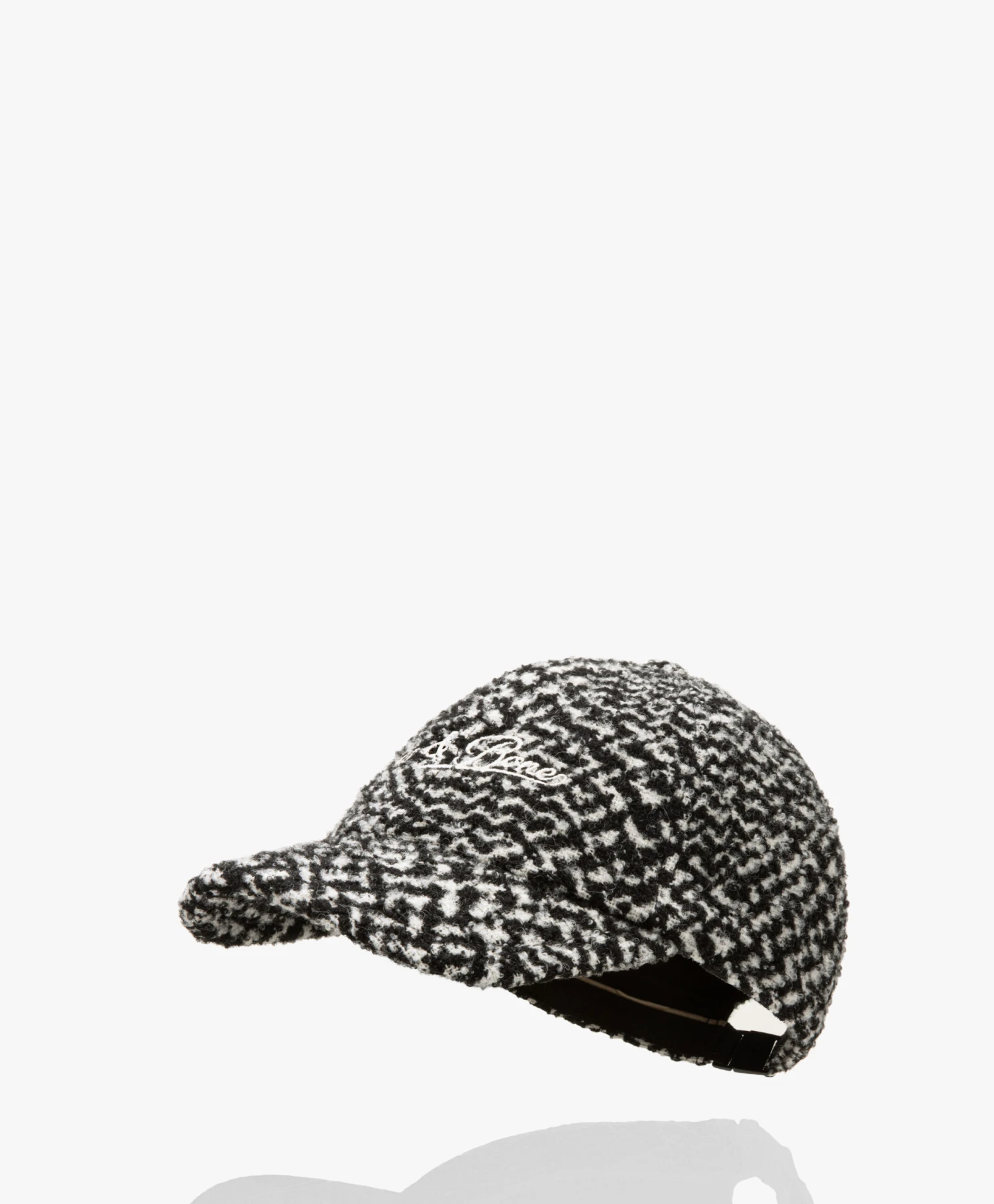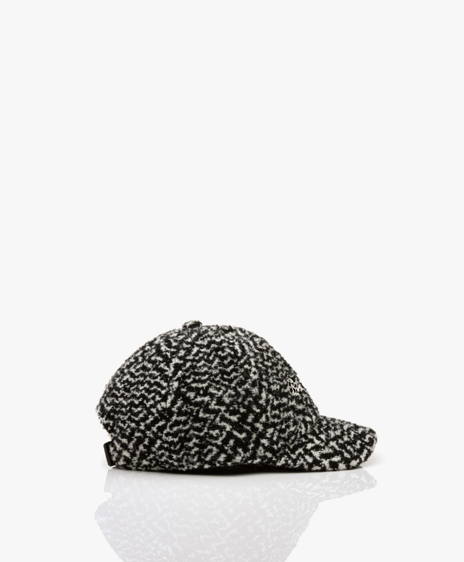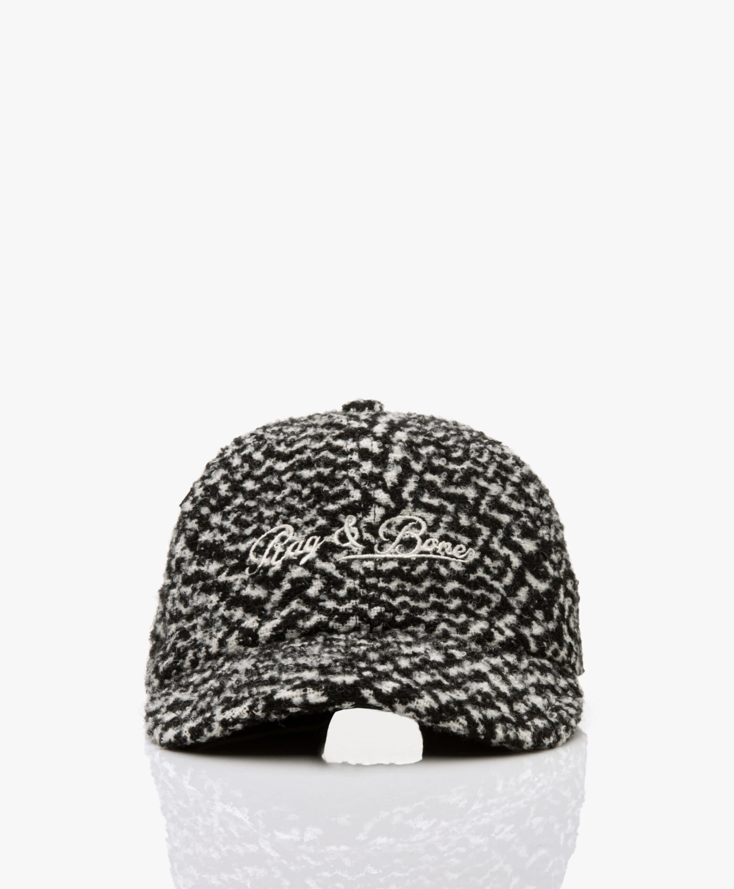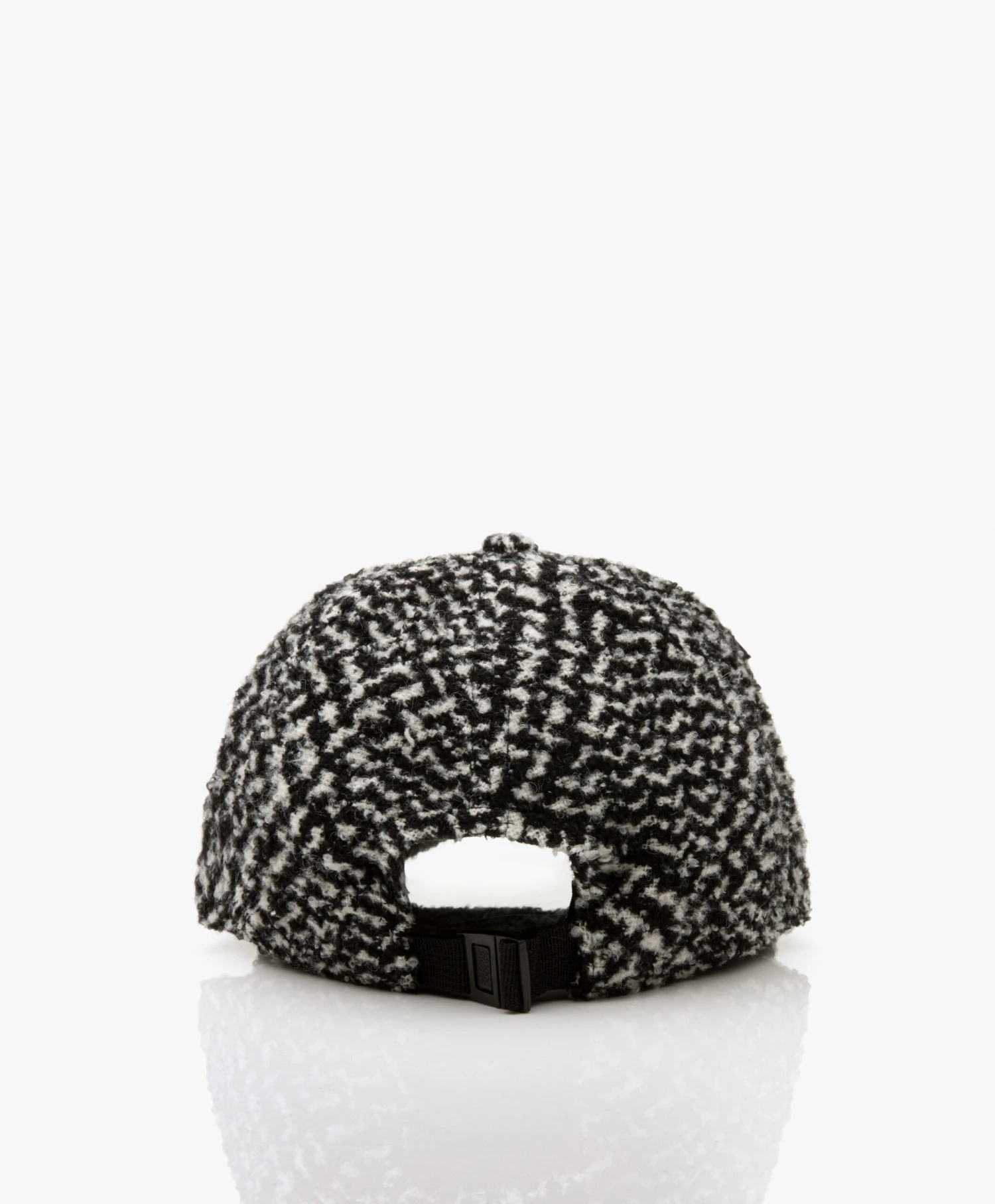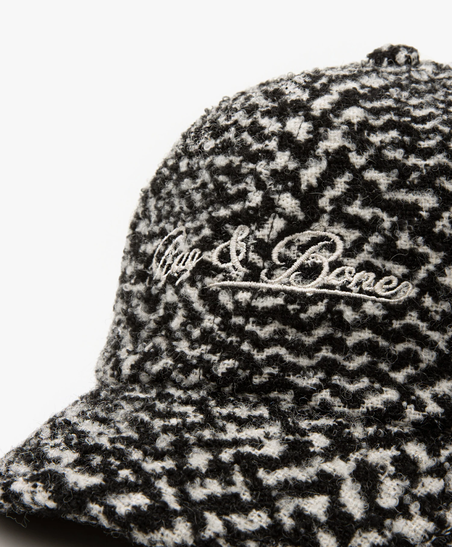 Deze pet is onderdeel van de rag & bone Heritage lijn, en dat zie je terug in zowel de bouclé garens als in de stijl van het logo. Twee klassieke aspecten, die lijnrecht tegenover de casual uitstraling van de baseball cap zelf staan. Gemaakt van een wolmix bouclé kwaliteit in een chevron geïnspireerd patroon in zwarte en witte garens.