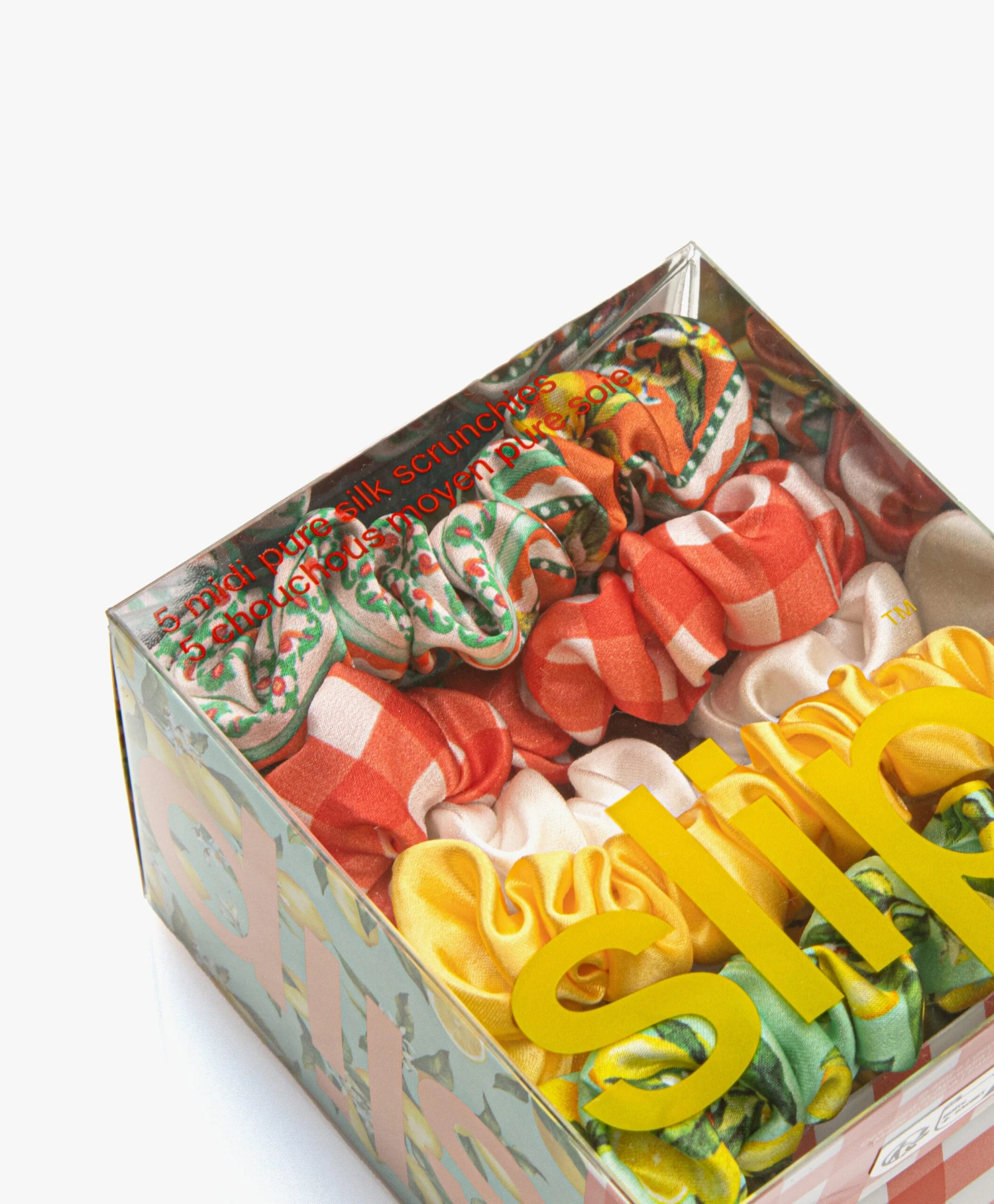 Tijd om je collectie haarelastieken een upgrade te geven. Dit 5-pack van slip™ bevat een combinatie van een medium-formaat scrunchies in off-white, zachtgeel, geblokt rood/wit, en koraaloranje met bloemenprint en zeegroen met citroenenprint – geïnspireerd op de zonnige, Italiaanse Amalfikust. De srunchies zijn niet alleen stijlvol, maar dienen ook als beschermend haaraccessoire dankzij de hoogste kwaliteit Mulbery zijde. De puur zijden kwaliteit heeft de perfecte glans, dikte en zachtheid waardoor haaruitval en beschadiging wordt voorkomen – met name tijdens het slapen.